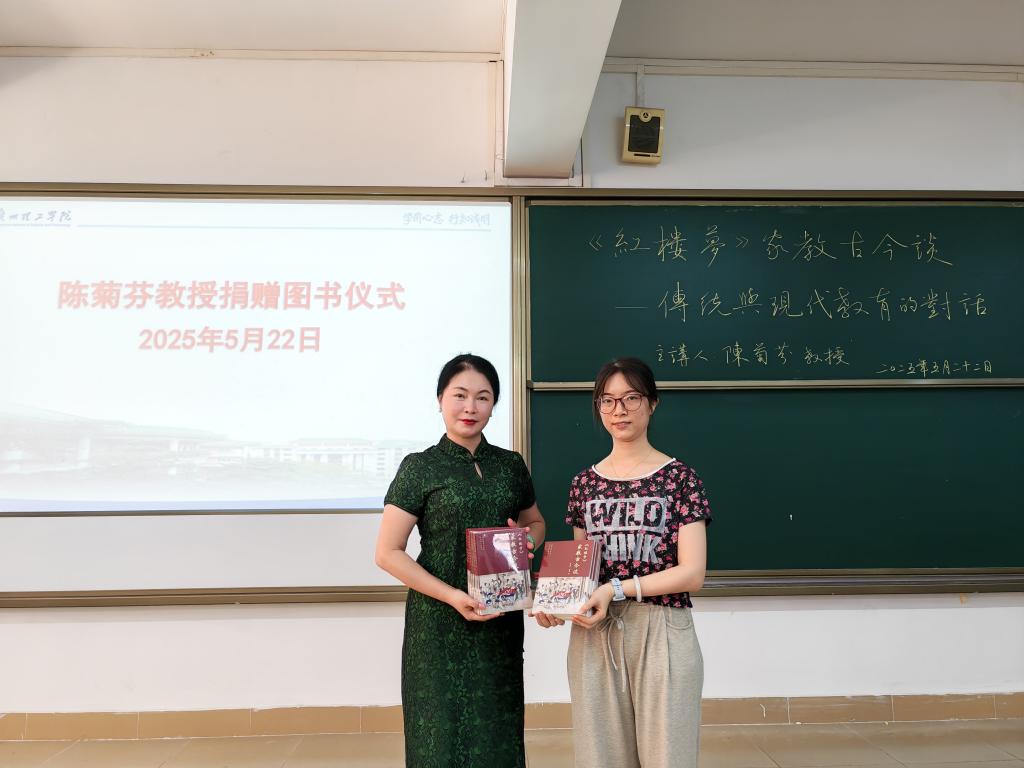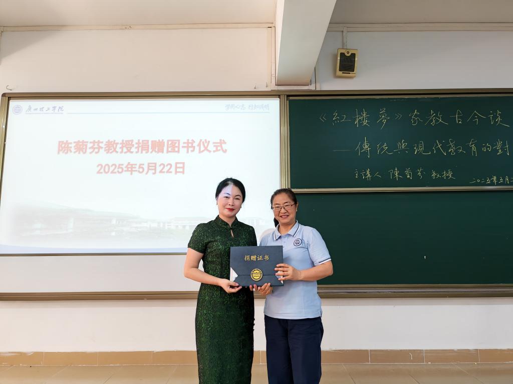 陈菊芬教授长期深耕于传统文化研究领域,在《红楼梦》研究与家庭教育等方向造诣深厚,成果丰硕。早在2023年12月,陈教授便向广州理工学院图书馆捐赠了《<溪山琴况>之中国音乐美学》《千年客韵:中华客家山歌》等多部著作。此次,她再次慷慨捐赠精心撰写的《<红楼梦> 家教古今谈》。这部著作独辟蹊径,巧妙地将古典文学巨著《红楼梦》与现代家庭教育相结合,以全新视角挖掘书中蕴含的家教智慧,为读者呈现了一幅古今家教文化交融的绚丽画卷。捐赠仪式上,图书馆馆员陈斯祺代表接收了这份珍贵的礼物,图书馆副馆长周武华为陈菊芬教授颁发捐赠证书,对其两次捐赠的善举致以由衷感谢。
