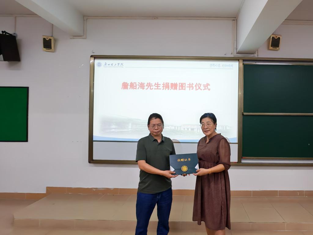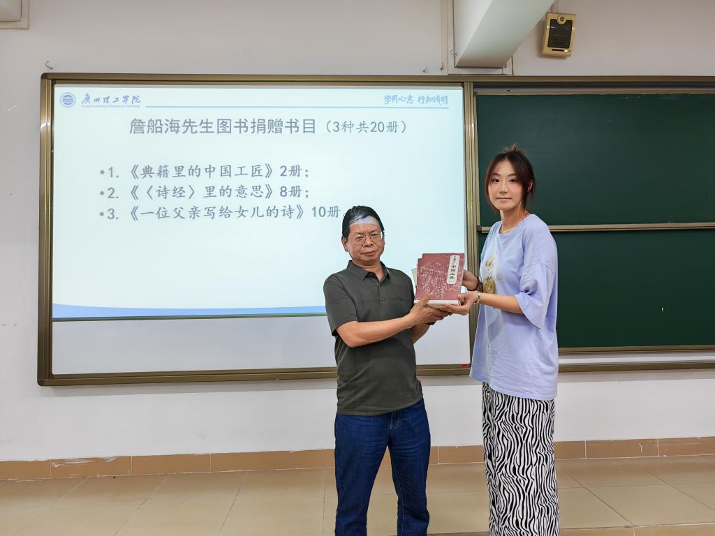 (陈斯祺)书籍,作为知识的载体与文化传承的桥梁。在知识传播与文化建设的征程中,每一次图书捐赠都如同一颗璀璨的星辰,照亮了求知者的道路。5月22日,广东技术师范大学教授陈菊芬和资深记者、作家詹船海先生,先后于广州理工学院白云校区7栋418室举行图书捐赠仪式,为校园文化建设注入新的活力。学校党委办公室李伟聪,图书馆副馆长周武华、馆员陈斯祺,人文与教育学院副院长陈南先、教授刘金冬、教师陈华、刘哲及师生代表共同见证了这一满载书香与温情的时刻。