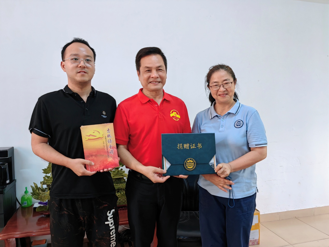 吴建荣先生捐赠了其首部著作《忠魂铸丰碑——南路吴川人民革命精神的不朽印记》26册。作为书中主人公吴勃校长的亲侄,吴建荣先生曾弃笔从戎,亲历对越自卫还击战,其著作具有广泛影响力。