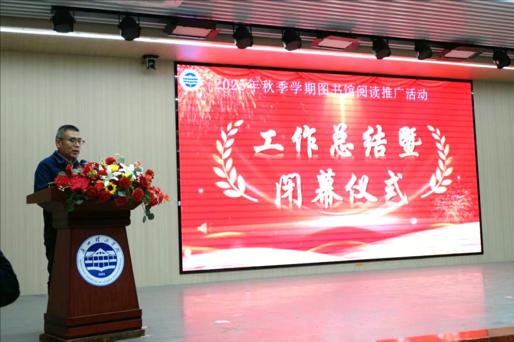 随后,图书馆副馆长陈有拾对素质教育周系列活动进行工作总结。他强调,图书馆作为校园文化精神地标与知识传播平台,始终以“学用心志,行知诚明”为核心指引,联动校内院系与校外优质资源,精心打造了一系列兼具深度与广度的文化活动。“这既是图书馆立足馆藏资源、链接多元力量、服务人才培养的生动实践,更是我们坚守以文化人、以文育人初心,助力师生精神成长的鲜明彰显。”他寄语广大同学,以本次活动为起点,将阅读融入日常,让思考成为习惯,用创新赋能成长,在书香浸润中成长为胸有丘壑、肩有担当、心有情怀的新时代青年。随着陈有拾副馆长的讲话结束,2025年秋季学期图书馆素质教育周活动正式落下帷幕。