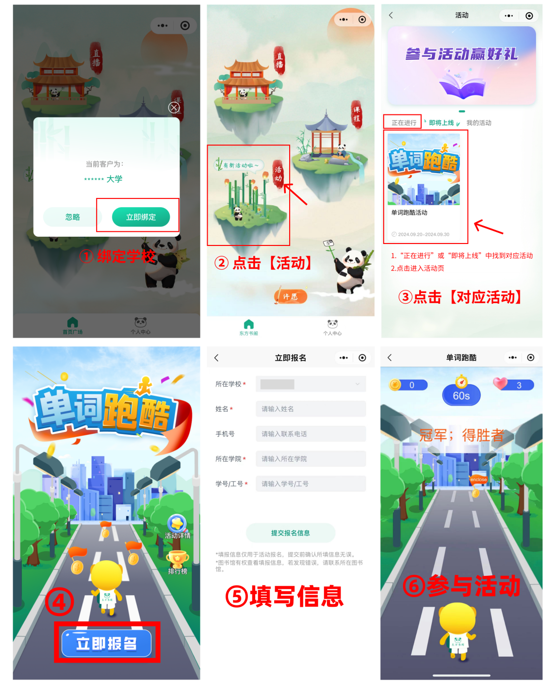 扫描二维码进入小程序,按提示绑定学校,点击对应活动进行报名,活动开始后即可参与