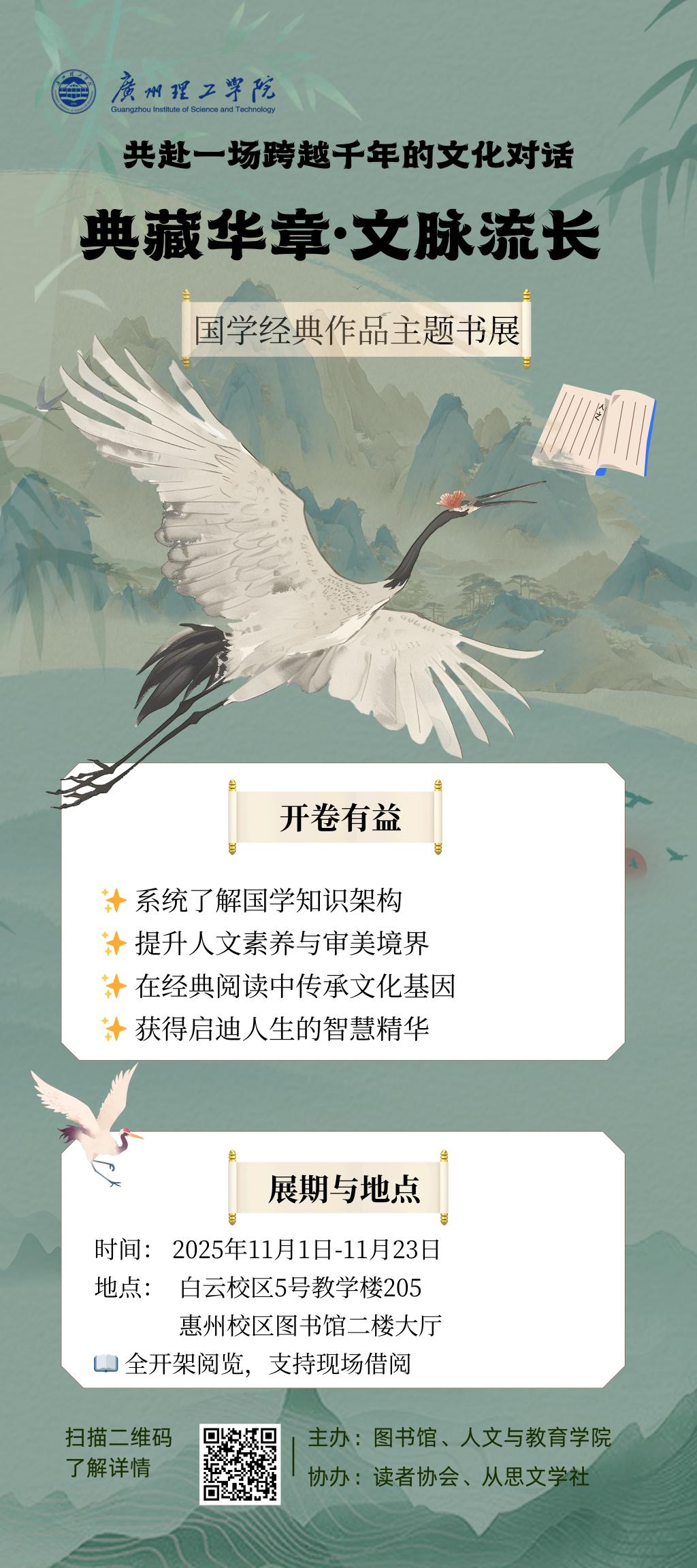 为弘扬中华优秀传统文化,激发我校学子对国学知识的学习热情,提升人文素养与精神品格,图书馆联合人文与教育学院,特举办国学主题书展。本次活动旨在通过经典阅读与文化浸润,引导广理学子在书香中感悟智慧,在经典中汲取力量,塑造优雅气质,增强文化自信。