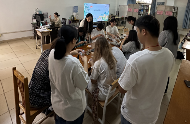 “你们知道吗?端午节的香囊里藏着古人的‘天然香水'智慧。”活动伊始,张老师手持精美的香囊标本,以中英双语讲述屈原的爱国故事,从汨罗江畔的龙舟竞渡,到家家户户悬艾蒲、佩香囊的习俗,图文并茂的讲解生动展现了端午民俗。俄罗斯姑娘明珠(RUSLANA)好奇地端详手中的锦布袋:“这个小布袋的花纹太漂亮了,很有特色啊!”人文学院学生小林则分享了儿时奶奶缝制香囊的温馨回忆,一场跨越国界的民俗对话悄然展开。
