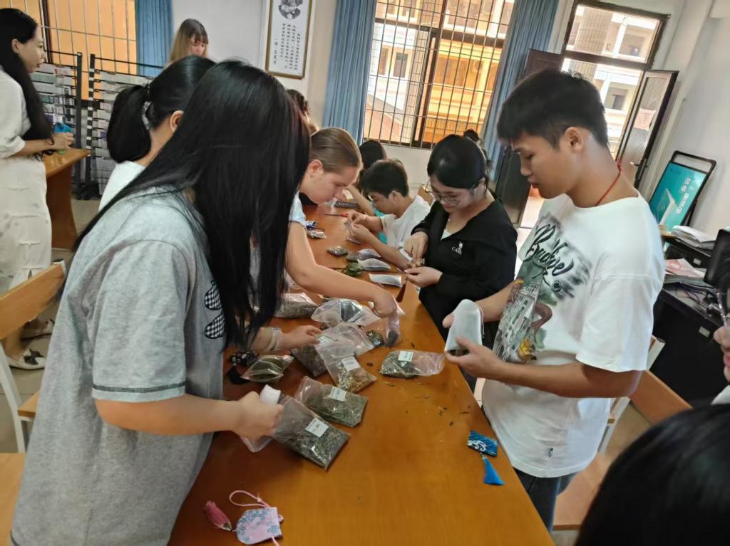 彩绸、丝线、艾草、丁香等材料铺满长桌,中外学子的协作正式拉开帷幕。“先把艾草和丁香按3:1的比例混合,这样香气更持久。”人文学院学生小王耐心地向俄罗斯交换生迪马(DMITRII)演示着草药配比,迪马则用不太流利的中文笑称:“这像是在调制魔法药剂!”中国学生教留学生分辨艾草与薄荷的香气,留学生则将分好类的香草按比例装入锦袋,不一会儿,绣有中国结等吉祥纹样的彩色香囊便摆满桌面。娜霞(ANASTASIIA)举起自己缝制的“平安符”香囊感叹:“原来每个针脚都藏着祝福!”